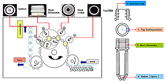 瓶胚的缺陷一般多出现在口部、肩部和底部,瓶胚检测方案采用6个高分辨率CCD相机,可对瓶胚的口、肩、底的各种缺陷进行全方位检查。其中,在口部上方放置1个相机采集口面图像可检查瓶口飞边、瓶口缺口、口面黑点等缺陷,在口部上方放置1个相机采集口内壁图像可检查瓶壁黑点、脏污等缺陷,在螺纹口侧面间隔120度放置3个相机对口螺纹和瓶肩部区域的各种尺寸、黑点、合缝线粗、飞边、台阶进行360度无盲区检查,在口部上方放置1个相机采集瓶胚底部图像可检查黑点、水口不良等缺陷。示意图如下: