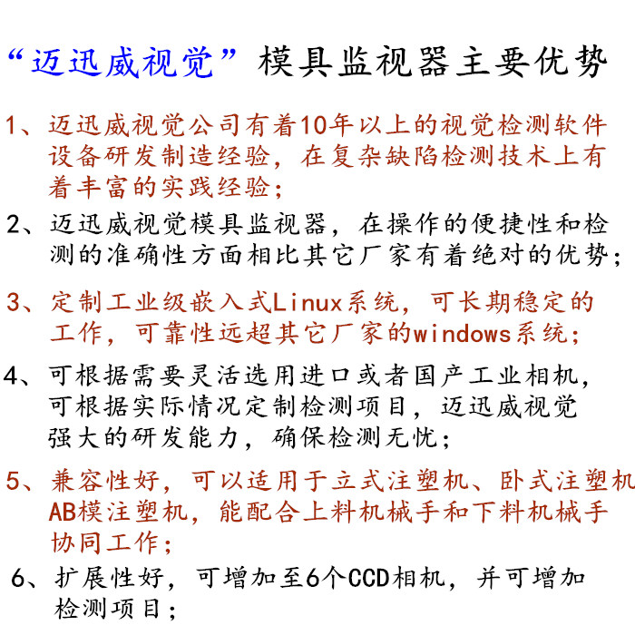 迈迅威“模具监视器”可根据需要 扩展至6个CCD相机,还可以根据现场检测需要,灵活增加检测项目,如果尺寸测量,缺陷检测等。